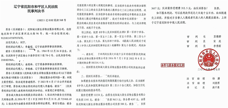 2023年10月,身为被告的刘女收到当地和平区法院的一审判决,法院竟然支持了这家物业公司的诉求,要求刘女士给付物业公司从2016年7月到2022年8月共58万余元的物业费.刘女士不服,上诉到沈阳市中级法院。庭审时,法官态度极其恶劣,居然袒护物业公司一方,根本不让念上诉状,说:“我问啥你答啥”。这样的庭审得出的结论也就可想而知了。3月6日,刘女士收到了市中院的判决书,判决的结果又支持了物业公司的的诉求,理由是:因为刘女士没亲眼看到招标人与投标人两家公司的利益输送,物业合同依然有效,综合物业费含供暖费、冷风费合理合法不予拆分,只是物业公司的服务实在是太差,象征性少收了4万元。刘女士向法官提出应该扣除停水、停电期间的综合物业费。法官则称:“说给你停水停电是你电费存款不够引起的停电,不是物业公司故意掐电造成的”。对此,刘女士十分不能理解,她说,不收电费和掐电造成的停电有什么区别吗?中院法官说这种话是法律知识不够还是另有其他的目的?法官还说:“给你下整改通知书、停水、停电的是前一个筑成物业不是现物业诚大新生活物业公司,所以我们没法扣除停水停电期间物业费”。刘女士问:“2016年7月招标完后,新物业公司已经进驻,情况发生在2017年7月3日,跟前物业有什么关系?既然一切服务都是原筑成物业公司干的,那新物业诚大新生活物业公司有什么资格来要物业费?”法官䃼充道:“这是两家物业公司同时在提供物业服务。刘女士又问:“根据《辽宁省物业管理条例》、《沈阳市物业管理条例》规定,物业费不能捆绑供暖费、电梯费。”法官说:“我们不受《辽宁省物业管理条例》、《沈阳市物业管理条例》约束。”经过一番争辩,法官大概也认为自己的判决有问题,将判决书收回。刘女士对这种既不愿花时间了解事实又不学习法理的法官,完全颠倒黑白的做法也是无语了。法官将本该重新判决或发回重审的案子,却下达了几乎维持原判的判决。刘女士问其理由,法官却说是业主太多,给刘女士改判怕其他业主全找上门来,这样他们法院会很麻烦。但是,在判决书送到刘女士手中之后又收回了,什么原因?刘女士不知,记者也不知。