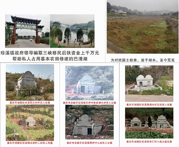 接到投诉后,记者前往重庆市涪陵区珍溪镇中峰社区,走访了当地村民。村民们说:书记镇长新官不管旧事,包庇纵容不交水费的其他村干部,不主持公道正义,还骗取国家三峡移民后扶资金,帮助私人借用国家项目资金几千万打造珍溪镇百汇巴清湖并非法占用上百亩永久基本农田,为应付上级检查,将占用的基本农田用绿色植物覆盖,湖水放干,现场至今可见。