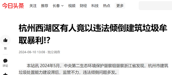而在中央第二生态环境保护督察组督察浙江时间发现,杭州市有关区、县(市)和部门对建筑垃圾治理的重要性和紧迫性严重认识不足,履职不到位,监督管理制度不落实,建筑垃圾违法倾倒问题多发。
