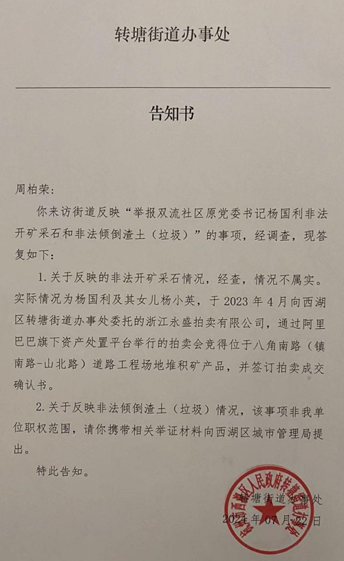 三是群众投诉问题解决不力。近年来,群众对建筑垃圾非法倾倒问题投诉不断,2023年1月至2024年4月,杭州市12345平台就接到此类问题投诉2700余件,一些问题重复投诉,始终未得到解决。督察发现,桐庐县分水镇武盛村被非法倾倒建筑垃圾9675立方米,侵占耕地3.2亩、林地1.7亩。富阳区新桐乡新店小高坞被非法倾倒渣土等共8675立方米,占地29.2亩,雨天大量渣土被冲刷进排洪沟,形成黄色泥浆水排入富春江。就拿周柏荣举报的杭州市西湖区转塘街道沈家坞路段(龙角路)偷倒建筑垃圾事件,他本人向双流社区领导反映过多次,但每次都如泥牛入海,有去无回。今年4月16日他又向转塘街道实名举报,结果直到7月22日在他反复要求下,才拿到一纸“告知书”。
