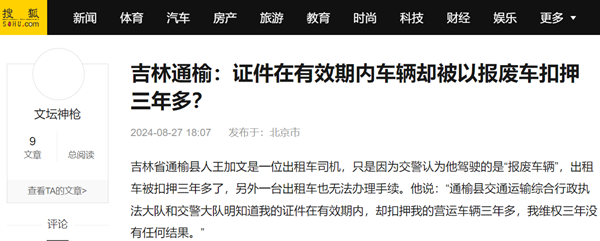 吉林省通榆县人王加文是一位出租车司机,只是因为交警认为他驾驶的是“报废车辆”,出租车被扣押三年多了,另外一台出租车也无法办理手续。他说:“通榆县交通运输综合行政执法大队和交警大队明知道我的证件在有效期内,却扣押我的营运车辆三年多,我维权三年没有任何结果。”
