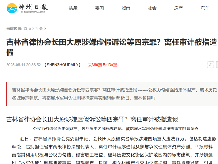 近日,吉林省律师协会党委副书记、会长田大原被实名举报涉嫌四项重大违法行为,包括制造虚假诉讼、违规担任省市两级律协法定代表人、离任审计程序造假及参与争议性集体资产分割。举报材料直指其利用职权与公权力勾结,侵害职工权益、破坏历史文化街区保护范围内的标志建筑,并涉嫌通过“水军伪证”删稿掩盖事实、阻碍调查。目前,相关材料已提交中央巡视组,事件持续发酵,引发法律界、媒体及公众的强烈关注。