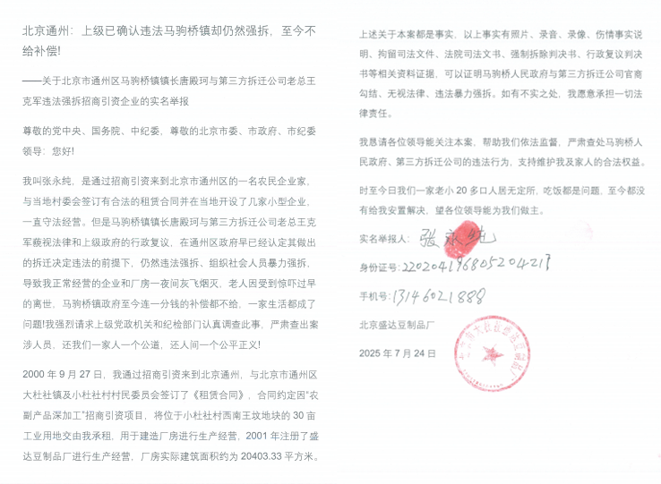 北京通州:上级已确认违法马驹桥镇却仍然强拆,至今不给补偿! 关于北京市通州区马驹桥镇镇长唐殿珂与第三方拆迁公司老总王克军违法强拆招商引资企业的实名举报 尊敬的党中央、国务院、中纪委,尊敬的北京市委、市政府、市纪委领导:您好! 我叫张永纯,是通过...