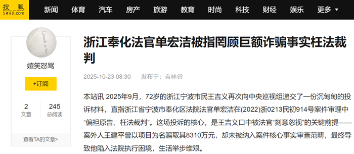 本站讯 2025年9月,72岁的浙江宁波市民王吉义再次向中央巡视组递交了一份沉甸甸的投诉材料,直指浙江省宁波市奉化区法院法官单宏洁在(2022)浙0213民初914号案件审理中“偏袒原告、枉法裁判”。这场投诉的核心,是王吉义口中被法官“刻意忽视”的关键前提——案外人王建平曾以项目为名骗取其8310万元,却未被纳入案件核心事实审查范畴,最终导致他陷入法院执行困境,生活举步维艰。