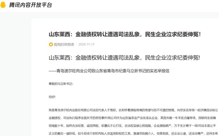 山东莱西:金融债权转让遭遇司法乱象,民生企业泣求纪委伸冤! 青岛波尔旺肉业公司致山东省青岛市纪委马立新书记的实名举报信 尊敬的马立新书记: 您好! 我是青岛波尔旺肉业股份有限公司法定代表人于雪初,此刻怀着濒临绝境的绝望与怒不可遏的愤慨,向您实名...