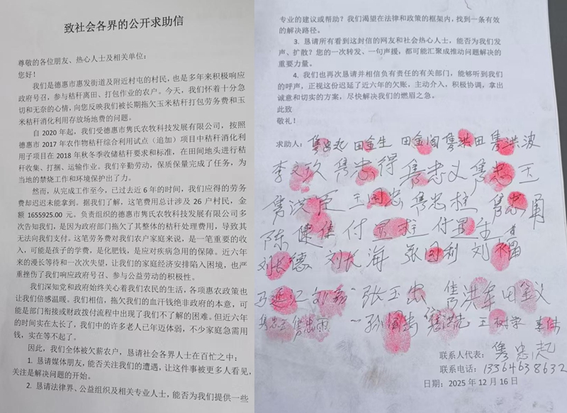 秸秆处理劳务费拖欠六年不给,德惠26个农户向社会各界的公开求助 尊敬的各位朋友、热心人士及相关单位: 您好! 我们是吉林省德惠市惠发街道及附近村屯的村民,也是多年来积极响应政府号召,参与秸秆离田、打包作业的农户。今天,我们怀着十分急切和无奈的心...