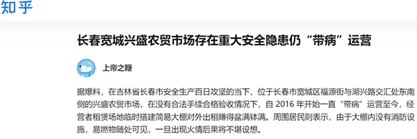 据爆料,在吉林省长春市安全生产百日攻坚的当下,位于长春市宽城区福源街与湖兴路交汇处东南侧的兴盛农贸市场,在没有合法手续合格验收情况下,自 2016 年开始一直带病运营至今,经营者租赁场地临时搭建简易大棚对外出租赚得盆满钵满。周围居民则表示,由于...