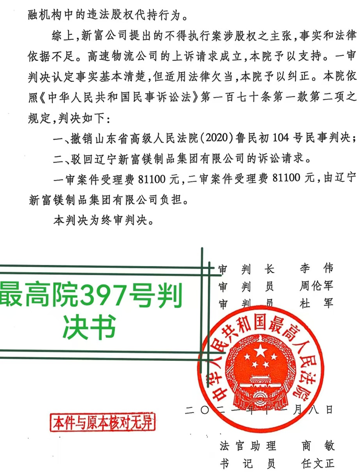 辽宁新富公司自然对最高院的397号判决不服。2022年7月,该公司上诉最高院要求再审,要求撤销397号错误判决理由十分充分。最高院2023年8月18日召开了听证会,并决定还要再次召开听证会,结果在2025年7月2日,新富公司收到了最高院驳回再审申请的裁定书,该裁定书认定的事实完全错误,颠倒黑白,论理上简直是强词夺理,因果关系论述混乱,逻辑不通,最终还是维护了错误的397号判决,驳回了新富公司的再审申请。