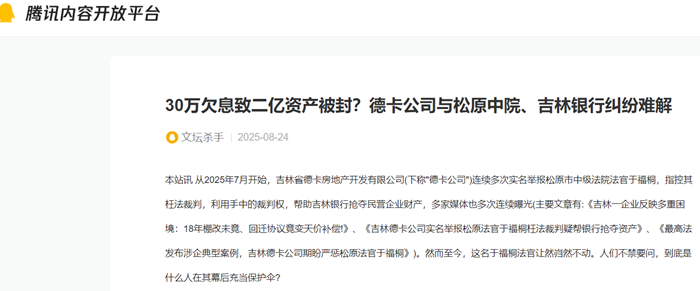 本站讯 从2025年7月开始,吉林省德卡房地产开发有限公司(下称德卡公司)连续多次实名举报松原市中级法院法官于福桐,指控其枉法裁判,利用手中的裁判权,帮助吉林银行抢夺民营企业财产,多家媒体也多次连续曝光(主要文章有:《吉林一企业反映多重困境:18年棚...