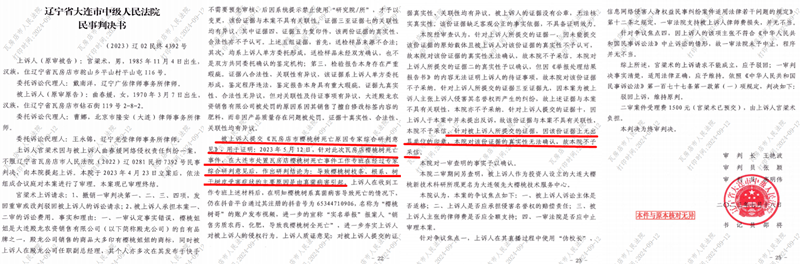 对于这些有证明力的合法证据,高兴利法官不予采信,却故意采信不合规的文件,即《关于瓦房店市樱桃树死亡原因专家综合研判意见》。这一研判意见没有任何机构盖章、没有任何专家签字,只是一张A4打印纸,毫无疑问不具有法律效力。同时,这个所谓的研判意见早已经被大连中院的生效判决否定,认定其为无效证据。详见大连市中级法院【2023】辽02民终4403号民事判决书第22页:“被上诉人(既大连殿龙公司)提交证据《关于瓦房店市樱桃树死亡原因专家综合研判意见》,用于证明2023年5月12日,针对此次瓦房店樱桃树死亡事件,大连市处置瓦房店樱桃树死亡事件工作专班在经过专家综合研判意见后,作出研判结论为:导致樱桃树枝条、根系、树干树皮受害症状的主要原因是由真菌病害引起。”但是,该判决书在第23页针对这份所谓的证据做出的认定却是:“针对被上诉人所提交的证据,因该份证据上无出具单位的印章,本院对该份证据的真实性无法确认,不予采信。”令人感到匪夷所思的是,【2023】辽02民终4403号民事判决书是在2023年7月18日做出的,并且是生效判决。而大连中级法院的另一个生效判决——【2023】辽02民终4392号民事判决书,同样否定了这份所谓的《研判意见》,该判决书做出的时间也是2023年7月18日,即高兴利做出判决两个月之前,见该判决书的第22至23页或(2023)辽0281民初261号民事判决书卷宗正卷2第173至174页。