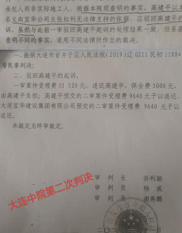 面对这个判决,高先生及大连宜华都不认可,一同又上诉到大连中院,这回,大连中院不再提“主体适格”这个法律用语,更不提欠款及超期工程款的事,一句话就将甘井子区法院的第二次判决给撤销了,到此,高先生又回到了原点,不说超工期部分,连那55万的欠款也没有了。