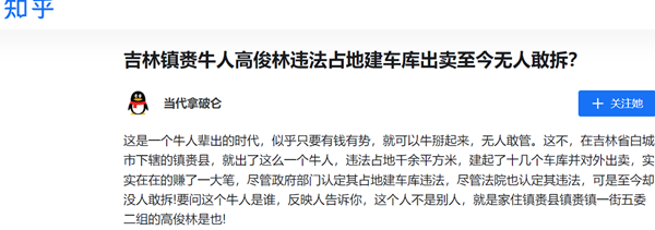 实名举报高俊林的是一个叫郝亚洲的人。郝亚洲在举报信里称:2010年未,高俊林未经国土资源管理部门批准,擅自占用镇赉县街北村集体耕地1239.07平方米建设车库,所建车库及其他用房设施最晚于2016年6月出售完毕。其占用的耕地内就有我的9眼水源井,高俊林于2016年2月份盗窃其井内设施,买通镇赉县公安局副局长郑伟,刑警队杨明和周兴,公安部门未对其立案侦查,他更加嚣张,之后就在井上盖车库出售。于是,郝亚洲2018年6月将此事反映到镇赉县自然资源局,但是由于镇赉县自然资源局法规监察科科长胡晓强出具的材料中申请执行的行为主体不够全面,没有确定已售出车库的所有人,法院未支持其强制执行的行政行为,镇赉县法院第一次裁定不予强制执行。胡晓强故意包庇高俊林,明知主体人员不全面还要故意申请法院强制执行,导致申请被驳回。在接到法院裁决后,胡晓强不改正其行政行为,反而提出复议,申请白城市中级法院裁定,结果是2020年7月28日中级法院作出的裁定书(2020)吉08行审复2号再次驳回复议申请,维持原裁定。