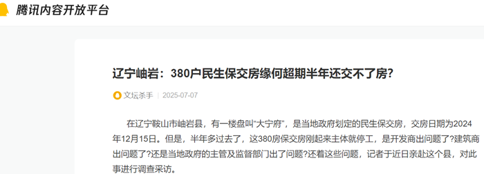在辽宁鞍山市岫岩县,有一楼盘叫“大宁府”,是当地政府划定的民生保交房,交房日期为2024年12月15日。但是,半年多过去了,这380房保交房刚起来主体就停工,是开发商出问题了?建筑商出问题了?还是当地政府的主管及监督部门出了问题?还着这些问题,记者于近日亲赴这个县,对此事进行调查采访。